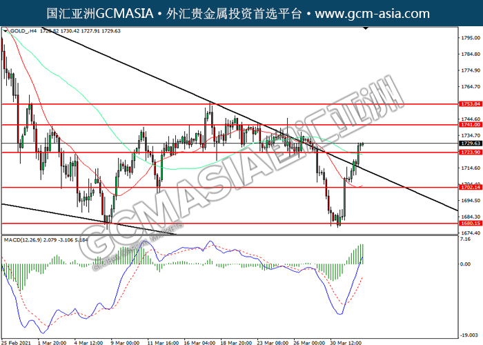 20210402 GOLD-午间 by keyk | Apr 2, 2021 | 黄金 | 0 comments GCMAsia-GOLD GOLD 2021-04-02 GOLD_,H4:黄金突破前期压力,持续上行。MACD多头动能略增,短期可关注多头为主。上方关注1741.00压力和1753.85压力,下方关注1723.90支撑和1702.15支撑。