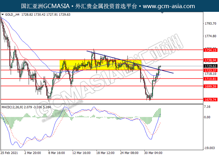 GOLD_,H4:黄金突破后持续上行。MACD显示多头信号,动能略增,短期可关注多头为主。上方关注1738.95压力和1754.15压力,下方关注1723.35支撑和1710.80支撑。