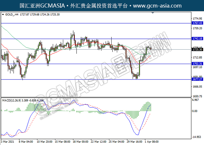 GOLD_,H4:黄金近期突破前期压力后持续上涨。然而,MACD多头动能开始略减,短期关注技术性空头回调趋势为主。上方关注1742.20压力和1767.45压力,下方关注1702.30支撑和1677.25支撑。