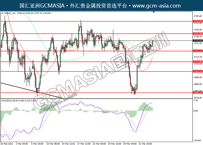 GOLD_,H4:黄金价格突破前期压力,震荡上行。然而,MACD多头动能略减,短期可技术性回调为主。上方关注1741.00压力和1753.85压力,下方关注1723.90支撑和1712.10支撑。