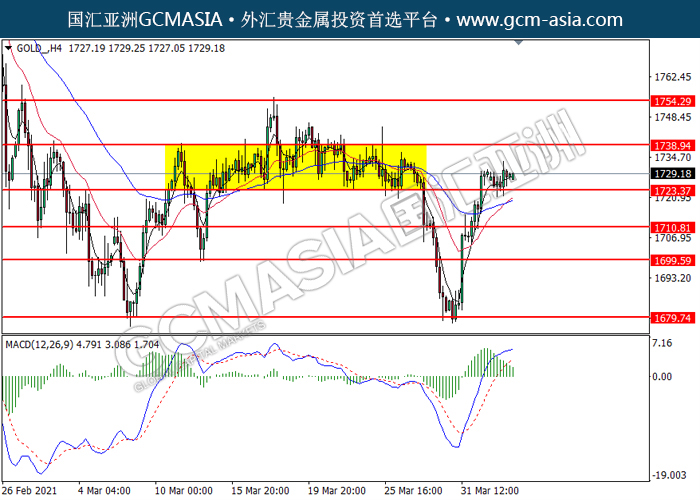GOLD_,H4:黄金突破后持续上行。然而,MACD显示空头信号,动能略减,短期可关注技术性回调。上方关注1738.95压力和1754.15压力,下方关注1723.35支撑和1710.80支撑。