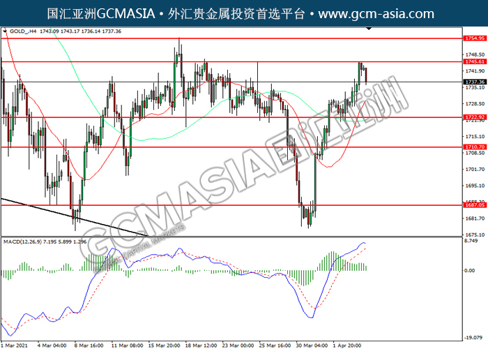 GOLD_,H4:黄金价格高位承压回落。MACD多头动能略减,短期可关注空头为主。上方关注1745.60压力和1754.95压力,下方关注1722.90支撑和1710.70支撑。