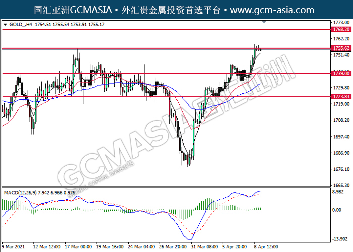 GOLD_,H4:黄金突破后持续上行,目前测试着压力位。MACD显示多头信号,动能略增,若突破可关注多头走势。上方关注1755.60压力和1768.20压力,下方关注1739.00支撑和1723.85支撑。