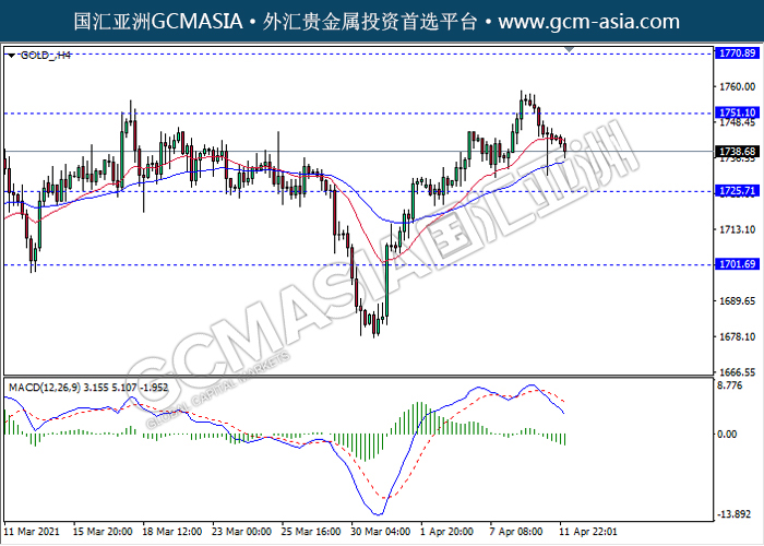 GOLD_,H4:黄金高位承压回落下跌。MACD形成死叉,动能略减,短期可继续关注空头方向为主。上方关注1751.10压力和1770.90压力,下方关注1725.70支撑和1701.70支撑。