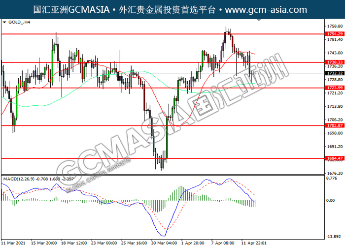 GOLD_,H4:黄金下破前期支撑,震荡下行。MACD显示空头动能略增,短期可关注空头为主。上方关注1738.35压力和1754.30压力,下方关注1724.00支撑和1702.85支撑。