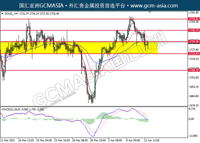 20210413 GOLD-午间 by keyk | Apr 13, 2021 | 黄金 | 0 comments GCMAsia-GOLD GOLD 2021-04-13 GOLD_,H4:黄金低位反弹。然而,MACD显示多头信号,动能略增,短期可关注多头走势。上方关注1735.05压力和1745.25压力,下方关注1723.85支撑和1708.35支撑。