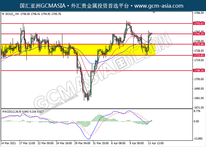 GOLD_,H4:黄金突破后持续上行,目前测试着压力位。MACD显示多头信号,动能略增,若突破可关注多头走势。上方关注1745.25压力和1755.60压力,下方关注1735.05支撑和1723.85支撑。