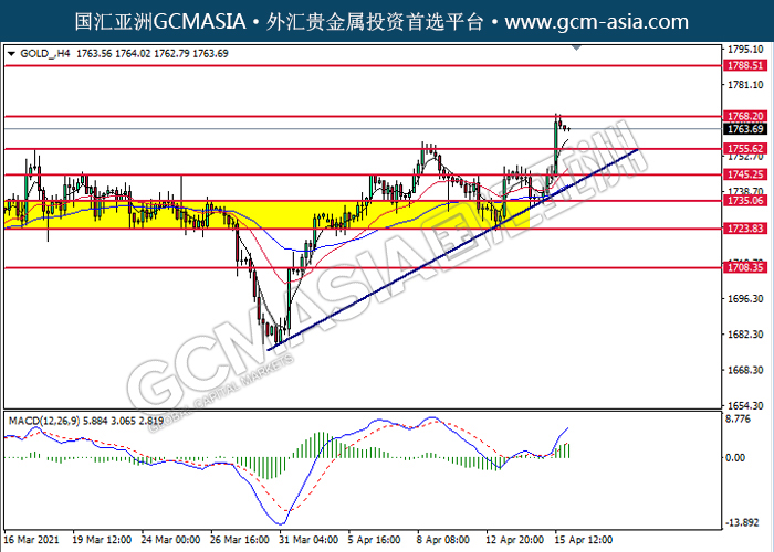 20210416 GOLD_ by willy | Apr 15, 2021 | 黄金 | 0 comments GCMAsia-GOLD GOLD 2021-04-16 GOLD_,H4:黄金高位承压后回落。MACD显示空头信号,动能略减,短期可关注空头走势。上方关注1768.20压力和1788.50压力,下方关注1755.60支撑和1745.25支撑。