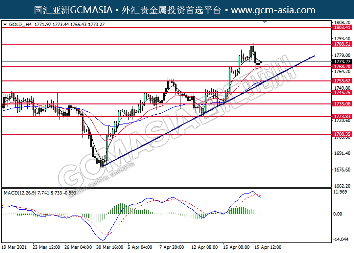 GOLD_,H4:黄金高位承压后回落,目前测试着支撑位。MACD显示空头信号,动能略减,若突破可持续关注空头趋势。上方关注1788.50压力和1803.40压力,下方关注1768.20支撑和1755.60支撑。