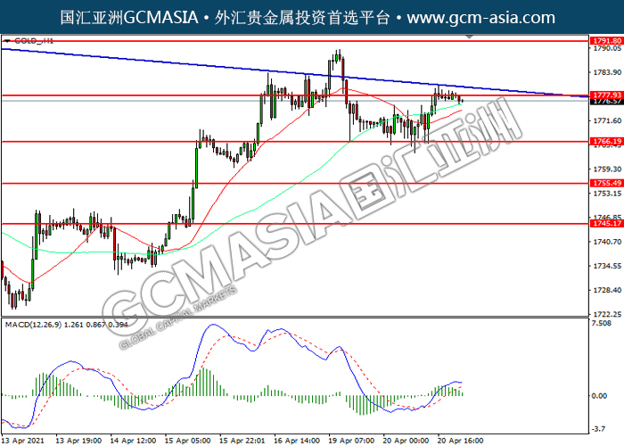 GOLD_,H4:黄金震荡上行,目前测试前期压力。然而,MACD多头动能略减,短期可关注技术性回调为主。上方关注1777.95压力和1791.80压力,下方关注1766.20支撑和1755.50支撑。