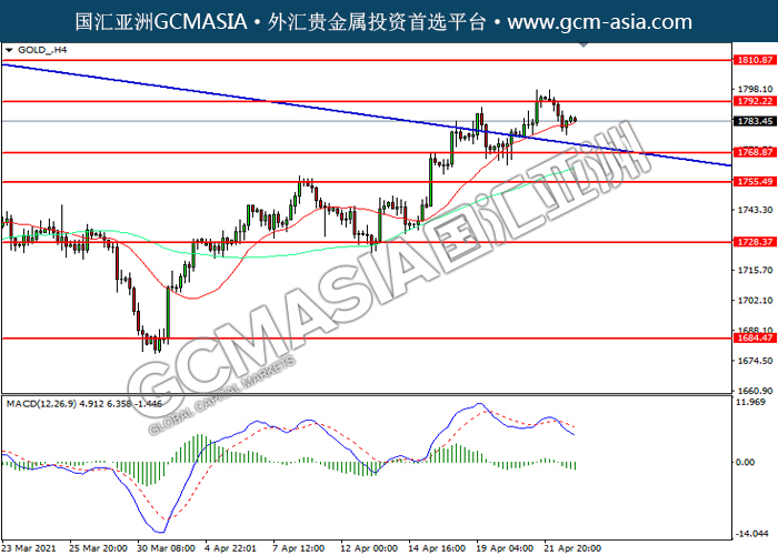 20210423 GOLD by willy | Apr 23, 2021 | 黄金 | 0 comments GCMAsia-GOLD GOLD 2021-04-23 GOLD_,H4:黄金高位承压回落。MACD空头动能略增,短期可关注空头为主。上方关注1792.20压力和1810.85压力,下方关注1768.85支撑和1755.50支撑。