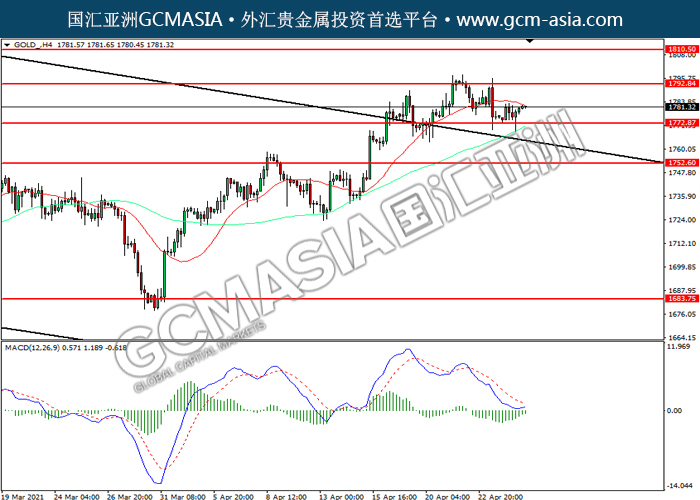 GOLD_,H4:黄金价格震荡上行。MACD空头动能略减,短期可关注多头为主。上方关注1792.85压力和1810.50压力,下方关注1772.85支撑和1752.60支撑。