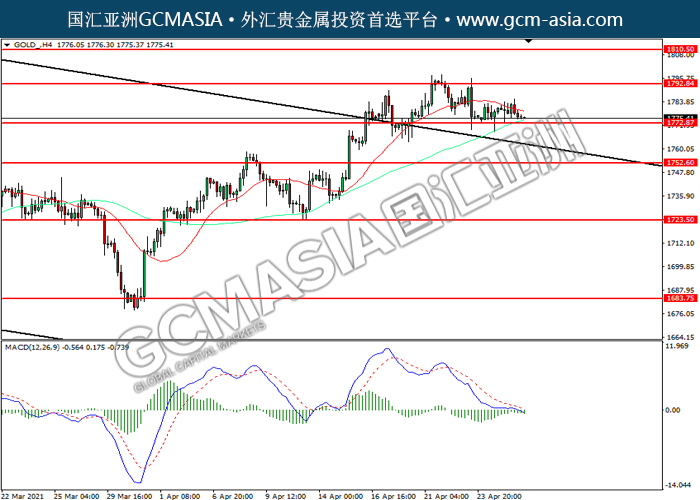 GOLD_,H4:黄金价格震荡下行,目前测试前期支撑。MACD空头动能略增,若下破可关注空头为主。上方关注1792.85压力和1810.50压力,下方关注1772.85支撑和1752.60支撑。