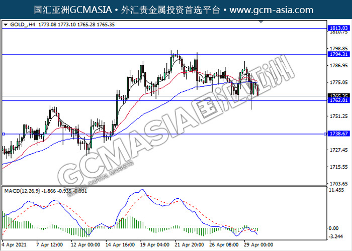 20210430 GOLD-午间 by keyk | Apr 30, 2021 | 黄金 | 0 comments GCMAsia-GOLD GOLD 2021-04-30 GOLD_,H4:黄金震荡下行,目前测试前期政策。MACD动能略减,若突破可继续看空为主。上方关注1794.30压力和1813.05压力,下方关注1762.00支撑和1738.65支撑。