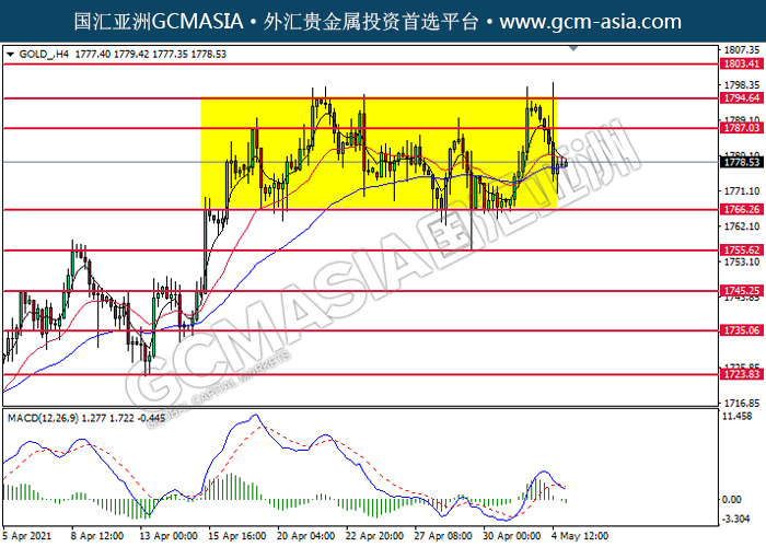 20210505 GOLD_ by willy | May 4, 2021 | 黄金 | 0 comments GCMAsia-GOLD GOLD 2021-05-05 GOLD_,H4:黄金低位反弹。然而,MACD显示空头信号,动能偏弱,短期可关注空头回调。上方关注1787.05压力和1794.65压力,下方关注1766.25支撑和1755.60支撑。