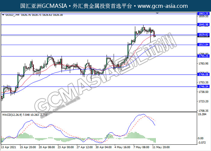 GOLD_,H4:黄金突破前期支撑,震荡下行。MACD形成死叉,动能略减,短期继续看空为主。上方关注1829.80压力和1846.00压力,下方关注1813.85支撑和1795.25支撑。