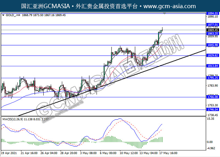 20210518 GOLD-午间 by keyk | May 18, 2021 | 黄金 | 0 comments GCMAsia-GOLD GOLD 2021-05-18 GOLD_,H4:黄金突破前期压力,多头排列。MACD动能持续略增,短期继续看多为主。上方关注1877.00压力和1894.55压力,下方关注1863.25支撑和1846.00支撑。