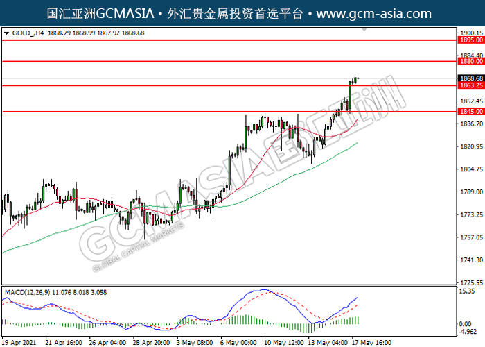 GOLD_,H4:黄金震荡上行。MACD已形成金叉,动能转强,短期可关注多头为主。上方关注1880.00压力和1895.00压力,下方关注1863.25支撑和1845.00支撑。