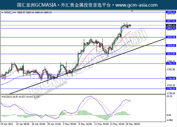 20210519 GOLD-午间 by keyk | May 19, 2021 | 黄金 | 0 comments GCMAsia-GOLD GOLD 2021-05-19 GOLD_,H4:黄金震荡盘整靠近前期支撑。MACD多头动能略减,若突破关注空头方向为主。上方关注1877.00压力和1894.55压力,下方关注1863.25支撑和1846.00支撑。