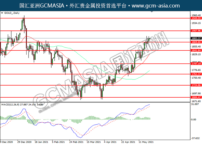 GOLD_,Daily:黄金突破前期压力,震荡上行。然而,MACD多头动能略减,短期可关注技术性回调为主。上方关注1907.95压力和1949.60压力,下方关注1869.80支撑和1841.65支撑。
