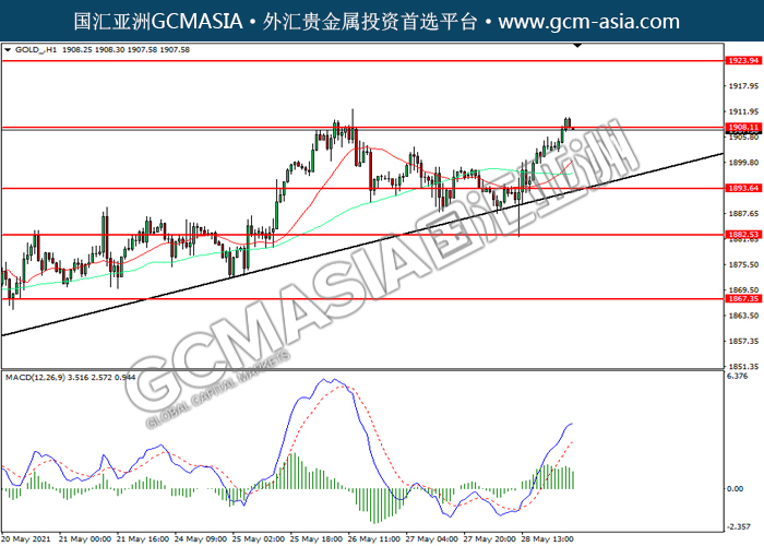 GOLD_,H1:黄金震荡上行,目前靠近前期压力。然而,MACD多头动能略减,短期可关注技术性回调为主。上方关注1908.10压力和1923.95压力,下方关注1893.65支撑和1882.55支撑。