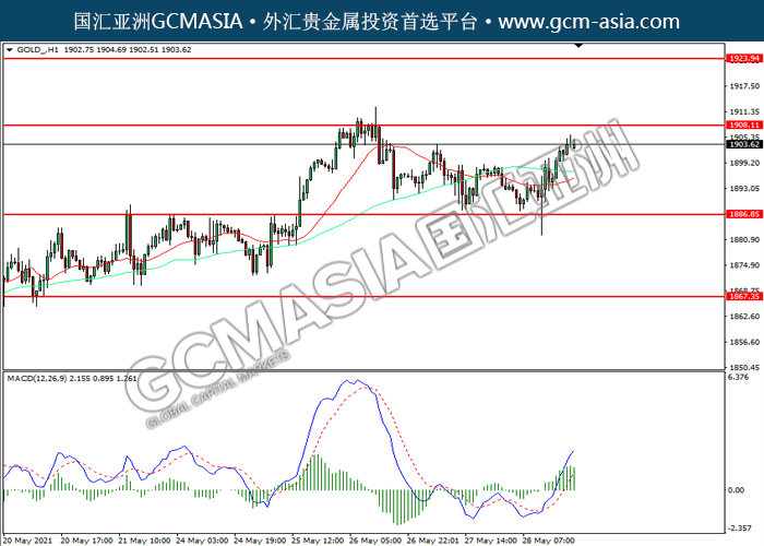 GOLD_,H1:黄金震荡上行,目前靠近前期压力。然而,MACD多头动能略减,短期可关注技术性回调为主。上方关注1908.10压力和1923.95压力,下方关注1886.85支撑和1867.35支撑。