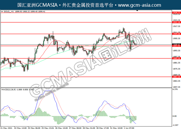 GOLD_,H1:黄金震荡上行,目前测试前期支撑。然而,MACD空头动能略减,短期可关注技术性回调为主。上方关注1909.70压力和1921.15压力,下方关注1897.95支撑和1885.55支撑。