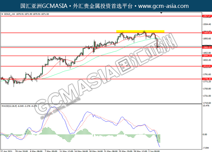 GOLD_,H4:黄金震荡下行,目前测试前期支撑。MACD空头动能略增,若下破可关注空头为主。上方关注1909.70压力和1957.05压力,下方关注1868.00支撑和1844.25支撑。