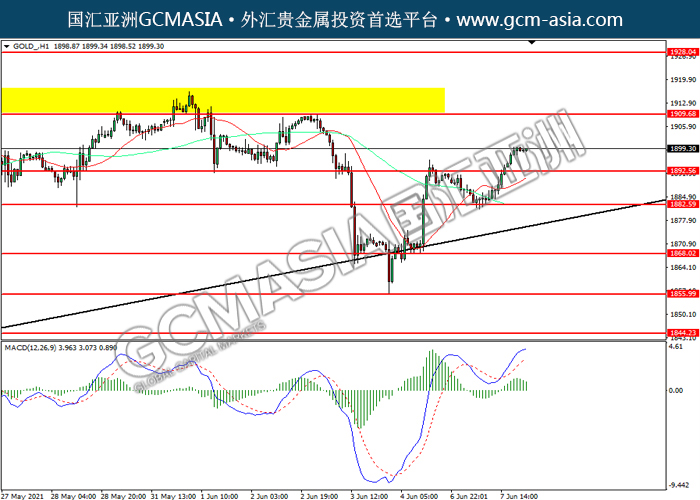 GOLD_,H1:黄金突破前期压力,震荡上行。然而,MACD多头动能略减,短期可关注技术性回调为主。上方关注1909.70压力和1928.05压力,下方关注1892.55支撑和1882.60支撑。