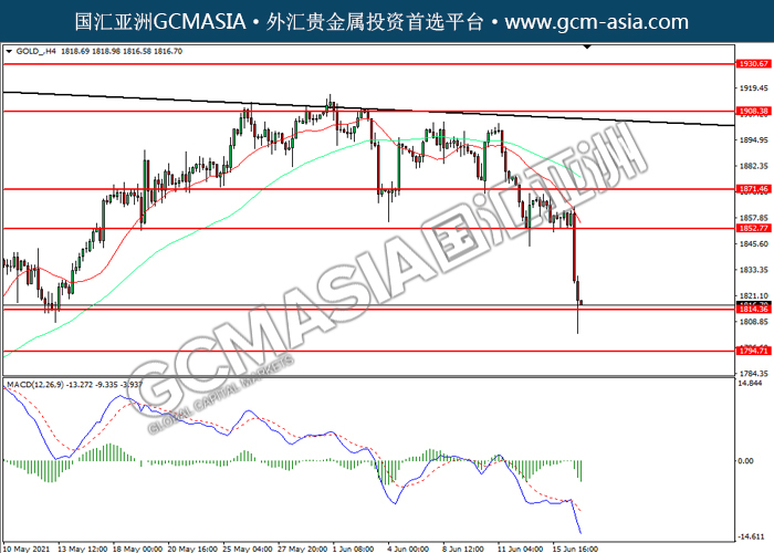 20210617 GOLD by willy | Jun 17, 2021 | 黄金 | 0 comments GOLD_,H4:黄金震荡下行,目前测试前期支撑。MACD空头动能略增,短期可关注空头为主。上方关注1852.75压力和1871.45压力,下方关注1814.35支撑和1794.70支撑。