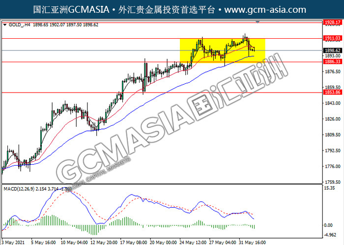 GOLD_,H4:黄金仍区间震荡交易,近期高位承压回落。然而,MACD显示空头信号,动能略减,短期可继续关注空头方向为主。上方关注1911.05压力和1928.15压力,下方关注1886.35支撑和1853.85支撑。