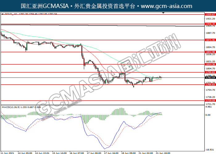 GOLD_,H1:黄金震荡上行。然而,MACD多头动能略减,短期可关注技术性回调为主。上方关注1795.85压力和1814.35压力,下方关注1766.85支撑和1729.60支撑。