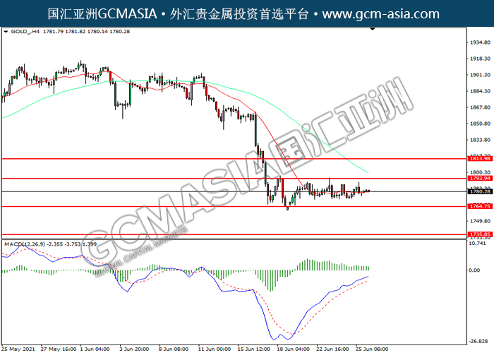 20210628 GOLD by willy | Jun 28, 2021 | 黄金 | 0 comments GOLD_,H4:黄金震荡下行。MACD多头动能略减,短期可关注空头为主。上方关注1793.95压力和1814.00压力,下方关注1764.75支撑和1735.85支撑。