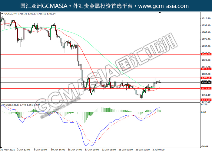 20210705 GOLD-午间 by willy | Jul 5, 2021 | 黄金 | 0 comments GOLD_,H4:黄金震荡上行,目前测试前期压力。然而,MACD多头动能略减,短期可关注技术性回调为主。上方关注1774.10压力和1794.65压力,下方关注1754.15支撑和1735.85支撑。