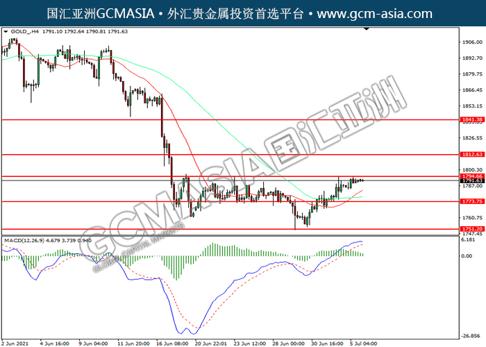 20210706 GOLD by willy | Jul 6, 2021 | 黄金 | 0 comments GOLD_,H4:黄金震荡上行,目前测试前期压力。然而,MACD多头动能略减,短期可关注技术性回调为主。上方关注1794.65压力和1812.65压力,下方关注1773.75支撑和1751.20支撑。