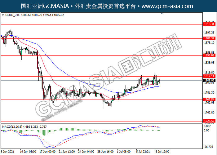 20210709 GOLD-午间 by keyk | Jul 9, 2021 | 黄金 | 0 comments GOLD_,H4:黄金高位承压回落。MACD显示空头信号,动能略减,短期继续看空回调为主。上方关注1812.10压力和1853.00压力,下方关注1767.55支撑和1725.50支撑。