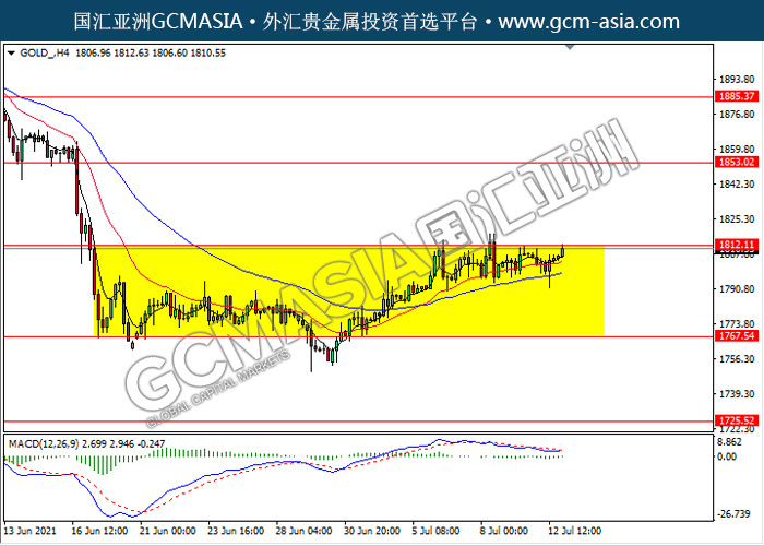 20210713 GOLD-午间 by keyk | Jul 13, 2021 | 黄金 | 0 comments GOLD_,H4:黄金仍区间震荡盘整,目前测试靠近前期压力。然而,MACD显示空头信号,动能略减,短期可关注空头趋势为主。上方关注1812.10压力和1853.00压力,下方关注1767.55支撑和1725.50支撑。