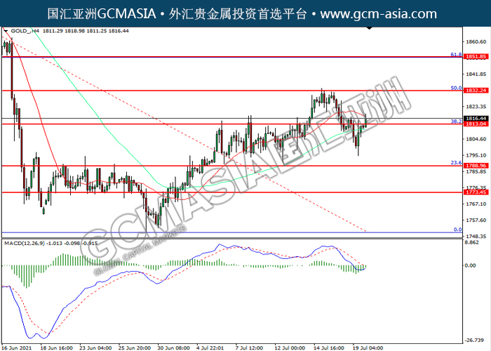 20210720 GOLD-午间 by willy | Jul 20, 2021 | 黄金 | 0 comments GOLD_,H4:黄金突破前期压力,震荡上行。MACD空头动能略减,短期可关注多头为主。上方关注1832.25压力和1851.85压力,下方关注1813.05支撑和1789.00支撑。