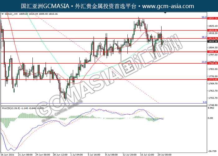 GOLD_,H4:黄金高位回落。然而,MACD空头动能略减,短期可关注技术性回调为主。上方关注1813.05压力和1820.85压力,下方关注1800.25支撑和1788.95支撑。