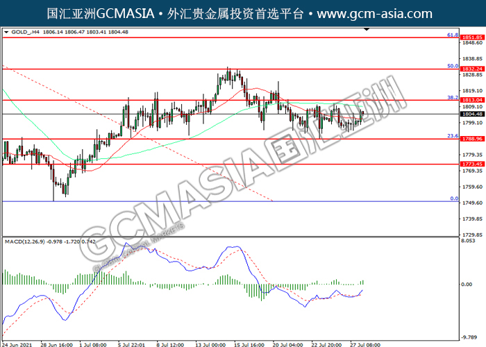 20210728 GOLD-午间 by willy | Jul 28, 2021 | 黄金 | 0 comments GOLD_,H4:黄金震荡上行。MACD多头动能略增,短期可关注多头为主。上方关注1813.05压力和1832.25压力,下方关注1788.95支撑和1773.45支撑。