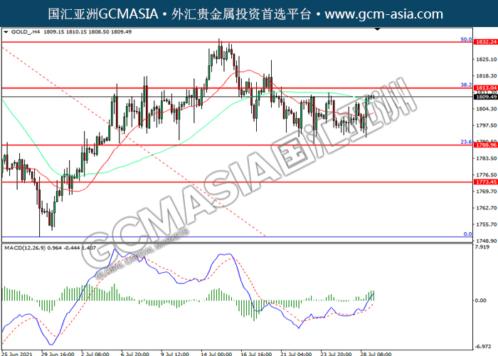 20210729 GOLD by willy | Jul 29, 2021 | 黄金 | 0 comments GOLD_,H4:黄金震荡上行,目前测试前期压力。MACD多头动能略增,若突破可关注多头为主。上方关注1813.05压力和1832.25压力,下方关注1788.95支撑和1773.45支撑。