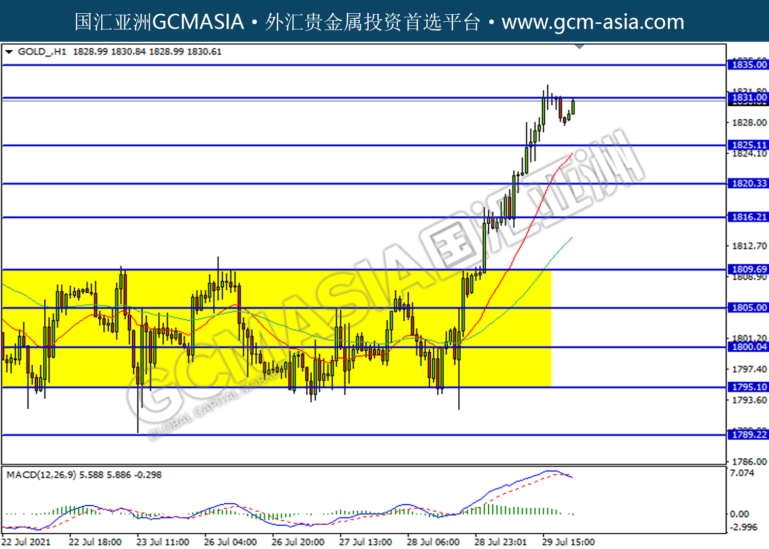 20210730-GOLD by willy | Jul 30, 2021 | 黄金 | 0 comments GOLD_,H1:黄金高位承压回落。MACD已形成死叉,动能转弱,短期关注空头为主。上方关注1831.00压力和1835.00压力,下方关注1825.10支撑和1820.30支撑。