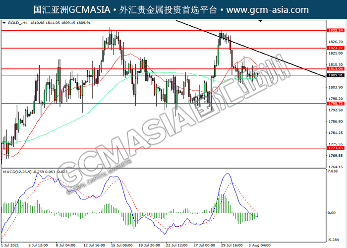 GOLD_,H4:黄金震荡下行。然而,MACD空头动能略减,短期可关注技术性回调为主。上方关注1813.05压力和1823.35压力,下方关注1795.70支撑和1773.45支撑。