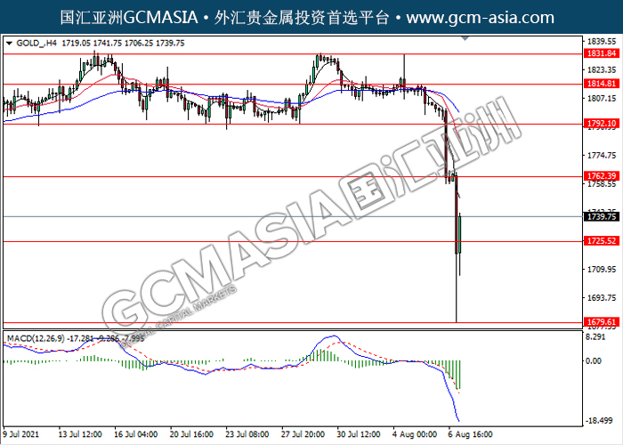 GOLD_,H4:黄金空头排列,目前测试靠近前期支撑。MACD动能持续略减,若突破继续看空为主。上方关注1762.40压力和1792.10压力,下方关注1725.50支撑和1679.60支撑。
