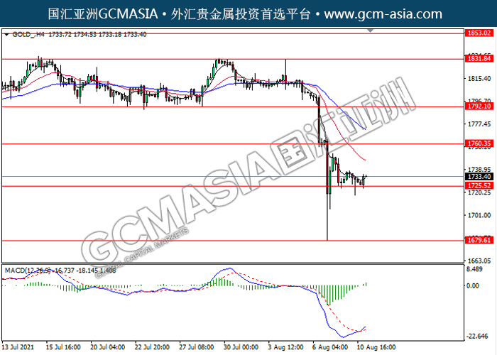 20210811 GOLD-午间 by keyk | Aug 11, 2021 | 黄金 | 0 comments GOLD_,H4:黄金低位反弹上行。MACD形成金叉,动能略增,短期可继续看多反弹为主。上方关注1760.35压力和1792.10压力,下方关注1725.50支撑和1679.60支撑。
