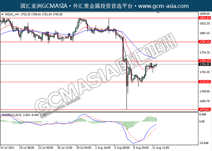 20210813 GOLD-午间 by keyk | Aug 13, 2021 | 黄金 | 0 comments GOLD_,H4:黄金低位反弹上行,目前测试靠近前期压力。然而,MACD多头动能略减,短期关注空头方向为主。上方关注1760.35压力和1792.10压力,下方关注1725.50支撑和1679.60支撑。