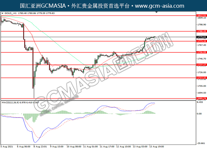 20210816 GOLD by willy | Aug 16, 2021 | 黄金 | 0 comments GOLD_,H1:黄金震荡上行。然而,MACD多头动能略减,短期可关注技术性回调为主。上方关注1788.50压力和1812.50压力,下方关注1773.35支撑和1756.10支撑。