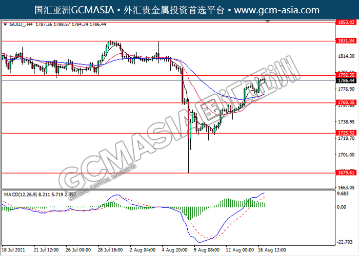 20210817 GOLD-午间 by keyk | Aug 17, 2021 | 黄金 | 0 comments GOLD_,H4:黄金多头排列,目前测试靠近前期压力。然而,MACD多头动能略减,短期关注技术性空回调为主。上方关注1792.35压力和1831.85压力,下方关注1760.35支撑和1725.50。