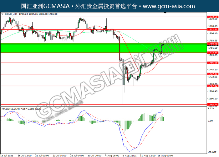 20210817 GOLD by willy | Aug 16, 2021 | 黄金 | 0 comments GOLD_,H4:黄金震荡上行,目前测试前期压力。然而,MACD多头动能略减,短期可关注技术性回调为主。上方关注1788.50压力和1812.50压力,下方关注1773.35支撑和1756.10支撑。