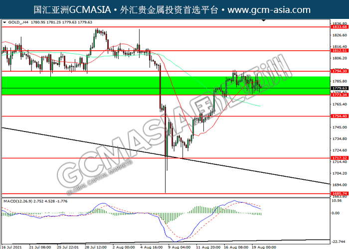20210820 GOLD by willy | Aug 19, 2021 | 黄金 | 0 comments GOLD_,H4:黄金高位回落。MACD空头动能略增,短期可关注空头为主。上方关注1794.30压力和1812.50压力,下方关注1773.35支撑和1754.40支撑。
